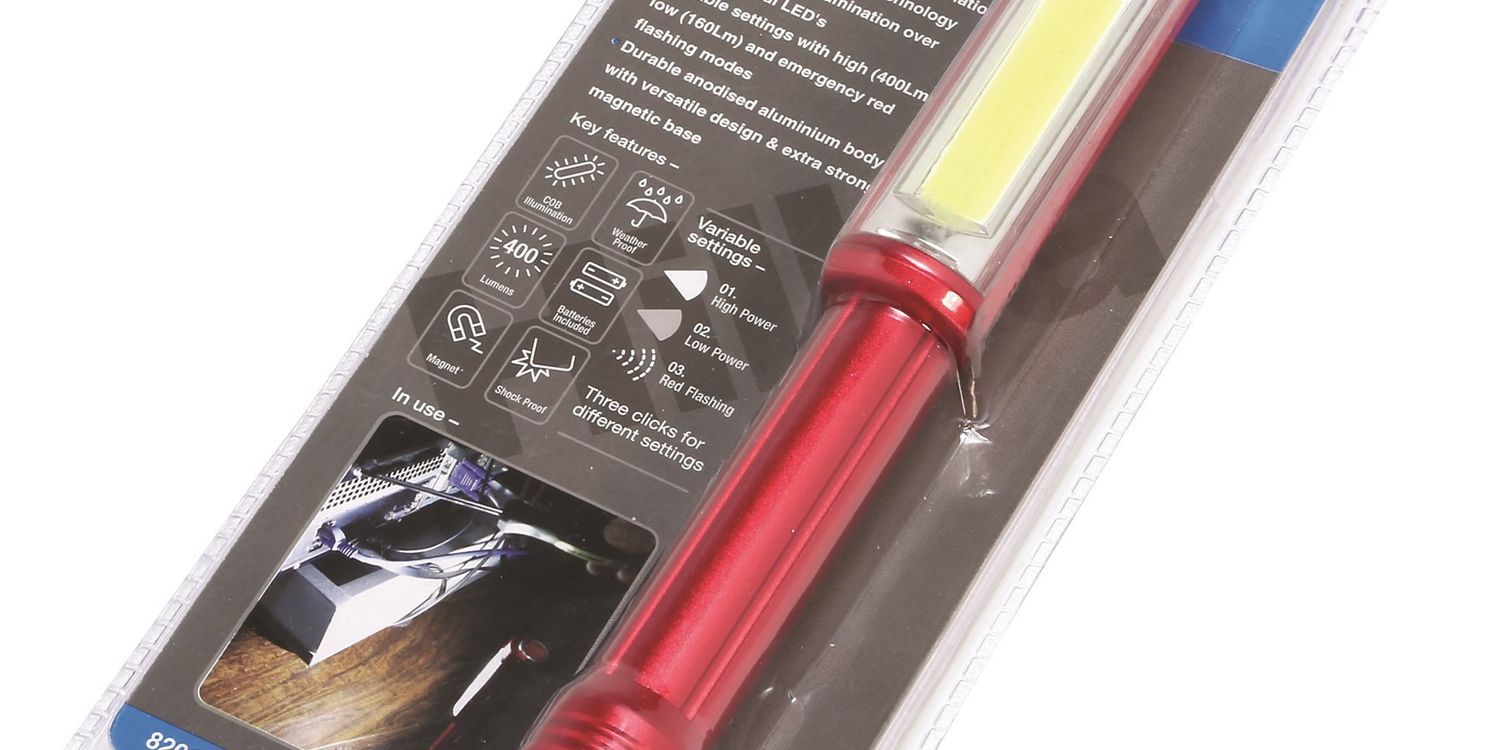 Powerful 4.5W COB 400 lumens light with chip on board (COB) technology offers superior illumination over conventional LED's. Variable settings with high (400Lm), low (160Lm) and emergency red flashing modes. Durable anodized aluminium body with versatile design & extra strong magnetic base. Ideal for boating, camping, household, mechanics and workshop use.