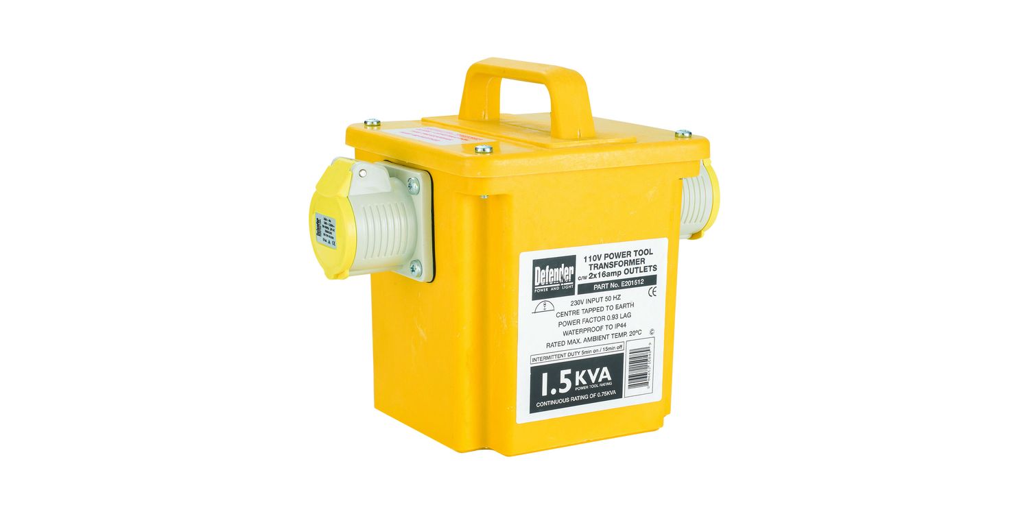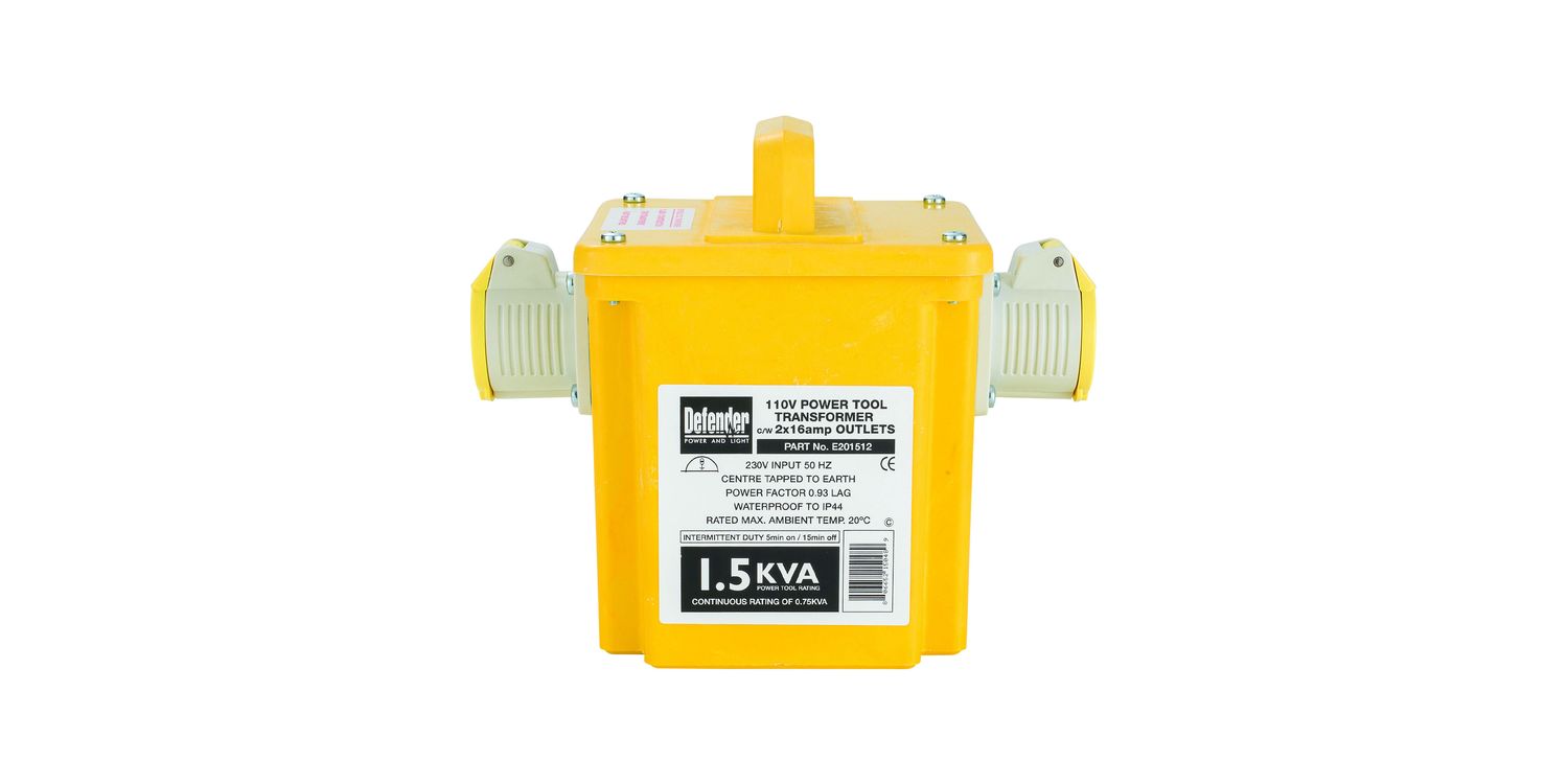 Popular transformer built for demanding construction tasks where mains voltage needs stepping down and isolating. Tough GRP case with two 110V 16A outlets. Resettable thermal overload protection. For use with lighting applications and corded hand tools such as hammer drills, impact drills, percussion drills and rotary hammer drills. Also suitable for use with other industrial items such as fume extractors. Intermittent rating of 1500W. Duty cycle 5mins on/15 mins off. Continuous rating 750W. Fitted with 110V 13A plug. Centre tapped to earth for extra safety. Specification: Outlets 2 x 16A. Rubber cable 2m, 1.5mm2, 3 core, H07 RNF. BS approved. Supplied with 13A plug. Dimensions 186 x 225 x 180mm. Weight 11kg.