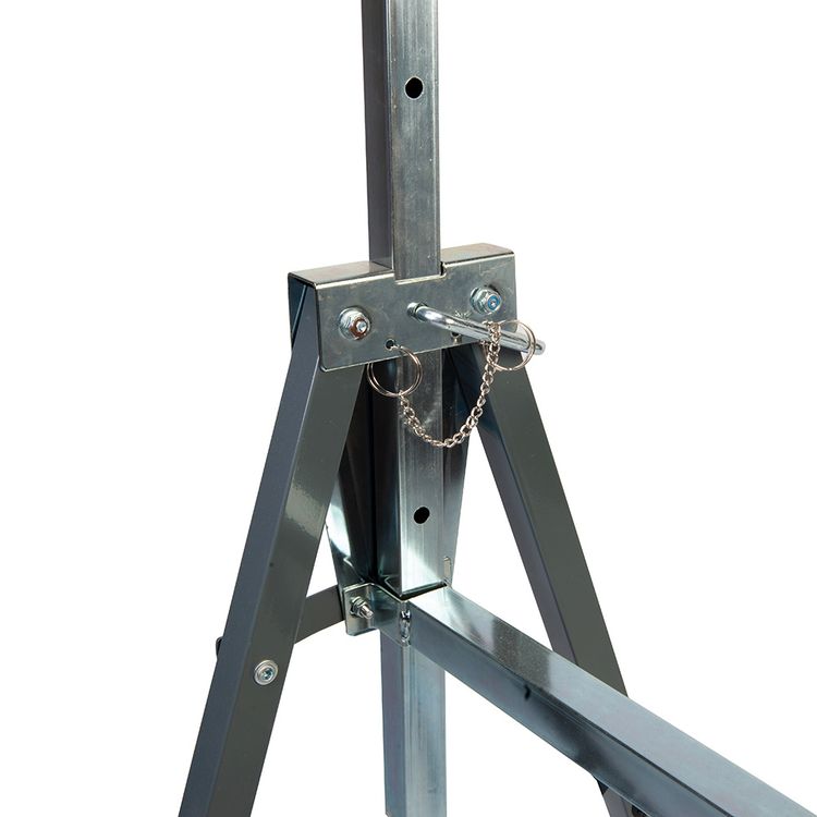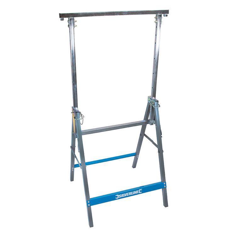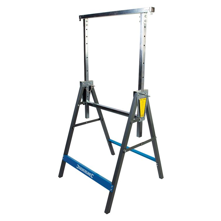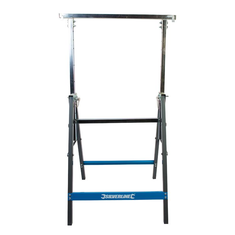 Heavy duty box section steel. Adjustable height and adjusting locking bars. Dual-locking safety arms and folding support braces for increased stability. Folds down for convenient storage. Maximum load capacity 150kg. 685mm wide. Adjustable height 810-1300mm. Requires assembly.