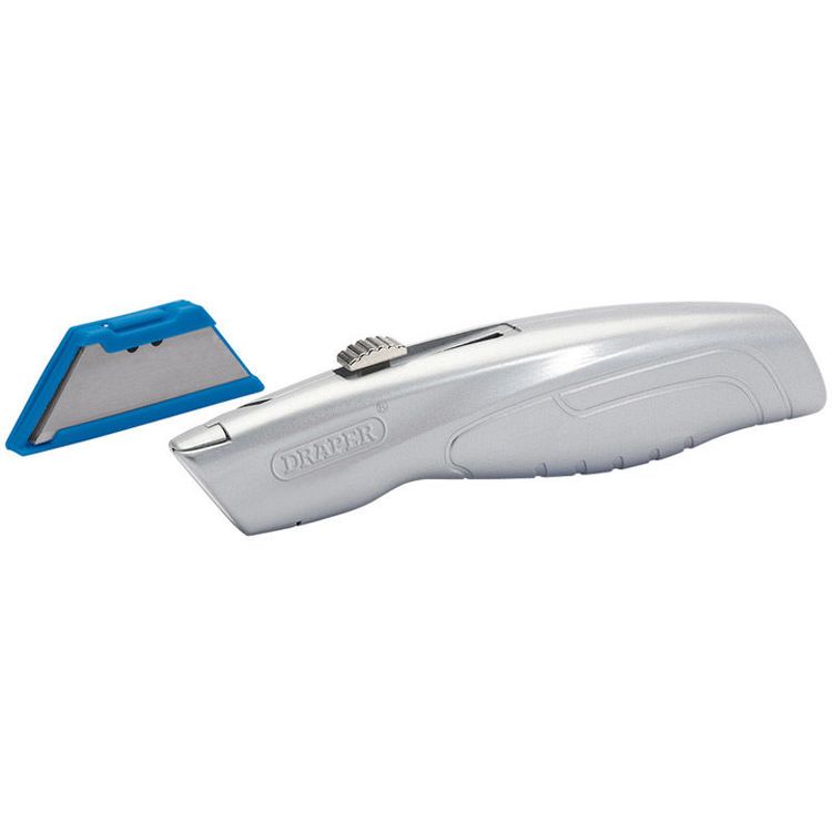 Retractable pattern complete with five two notch blades in holder. Diecast zinc alloy body. Display packed.