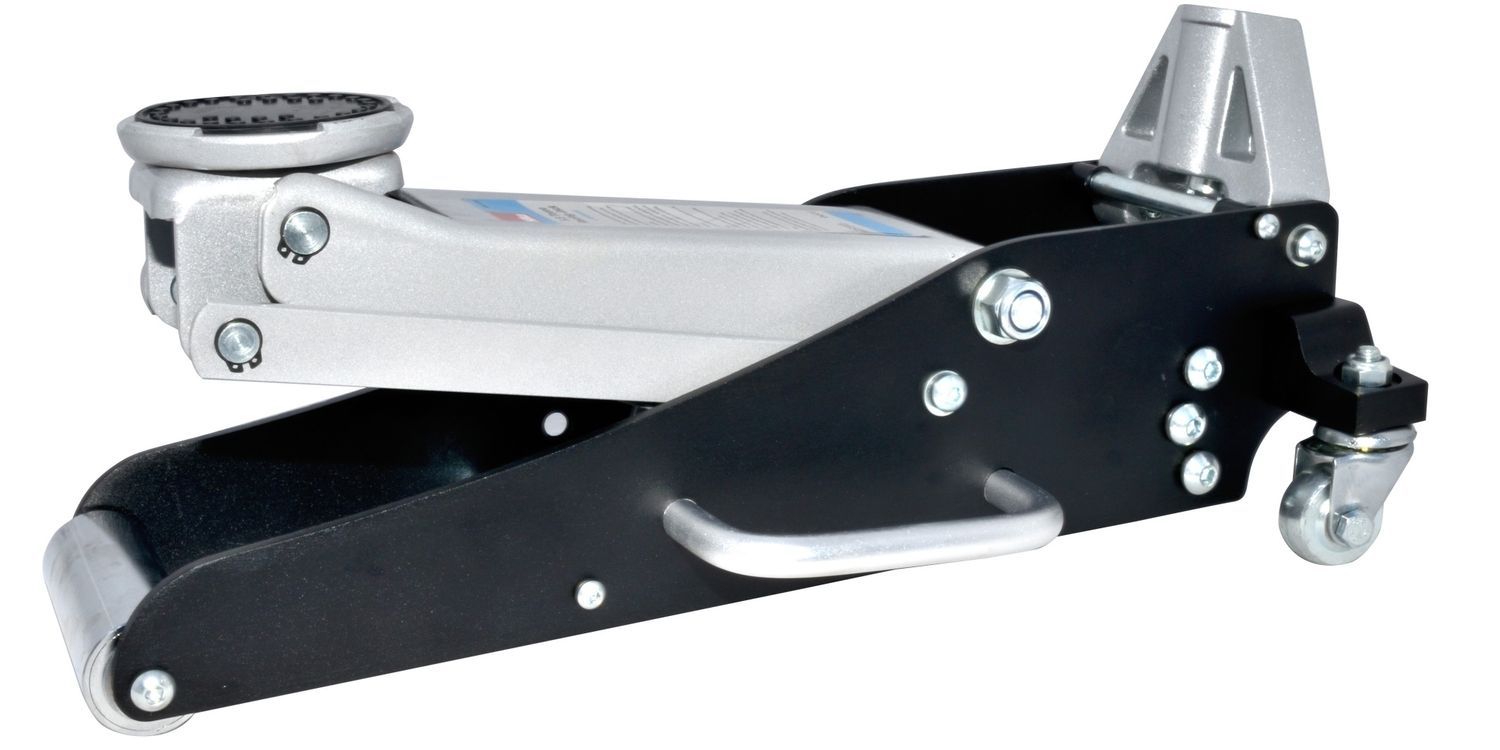 Racing style 1.5 Tonne jack manufactured from Aluminium and Steel to reduce weight. Low profile with dual pumps for a quicker, smoother lift. Lifting range of 90 to 358mm. Low profile design for lowered cars. Side carrying handles for quick portable use. Fast access with front roller wheel. Built in pump overload prevents over loading for safe operation with hydraulic bypass system to stop ram over travel. Foam handle cover and jack pad to protect bodywork when in use. Product size: 590 x 290 x 175mm, weight 15.60kg, packed in colour box.