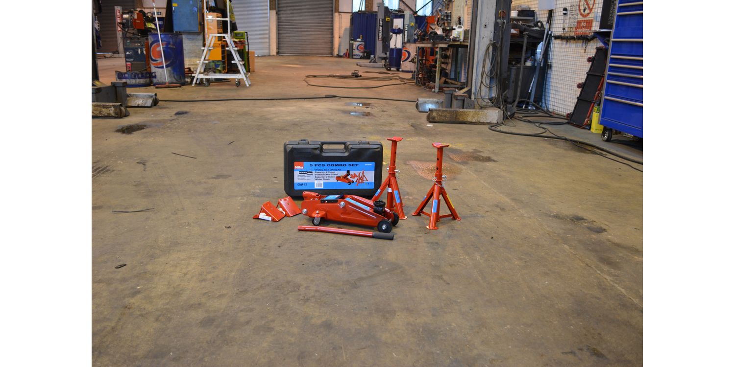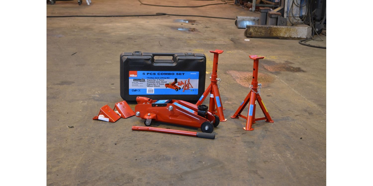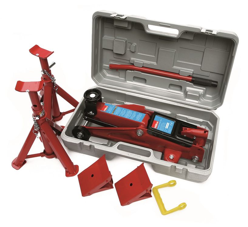 All steel construction compact heavy duty jack with 2 tonne axle stands and safety wheel chocks. Covers lifting and safety needs. Jack lifting range 135mm to 340mm with built in pump overload prevents over loading for safe operation with hydraulic bypass system to stop ram over travel. Supplied with heavy duty plastic carrying case for safe storage. Product size: 510 x 300 x 17mm, weight 14.8kg.