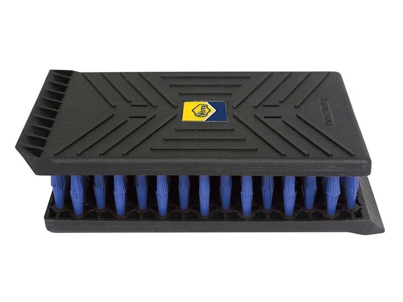The Vitrex Pro Trowel Cleaner provides a safe and efficient solution for cleaning trowels and other thin tools. Its sturdy nylon bristles effectively dislodge any leftover material on the trowel, saving both time and money compared to conventional cleaning methods. It keeps your hands safely distanced from the notches to prevent cuts while enhancing control. Additionally, it features an integrated scraper that aids in removing stubborn debris and cleans thoroughly to the spine.