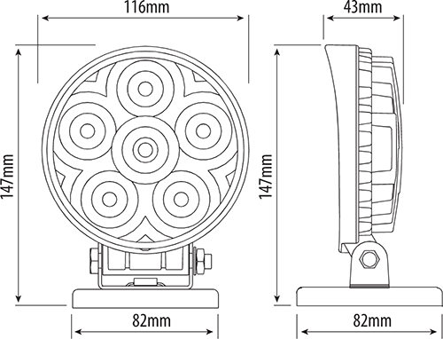 IP67. EMC approved. Housing: Aluminium. Lens: Acrylic. Supplied with 9.5 M cable with switched in-vehicle adaptor.