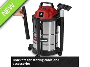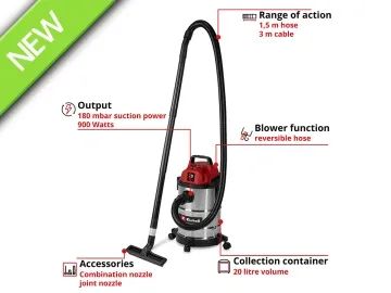 The Einhell TC-VC 2045 S Wet/Dry Vacuum Cleaner is perfectly suited for thorough cleaning around the house, workshop and garage. With 900 W of power and a suction capacity of 180 mbar, it reliably removes dust, dirt and liquids from a wide variety of surfaces. Even hard-to-reach areas can be easily cleaned when using the blowing connection.