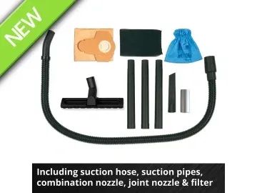 Supplied with: 1 x Suction Hose 36mm x 1.5m, 3 x Extension Pipes, 1 x Adaptor, 1 x Large Suction Nozzle, 1 x Crevice Nozzle, 1 x Dirt Bag, 1 x Filter Bag and 1 x Foam Filter.