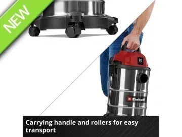 Equipped with a 20 litre stainless steel container, 1.5m long plastic suction hose (Ø 36mm) and a 3-piece plastic suction pipe. You can use the 3m long power cable to extend this range of action up to 4.5m. The power cable can be wound directly onto the vacuum cleaner housing for easy storage. Easy to move thanks to its four rollers and integrated carrying handle.
