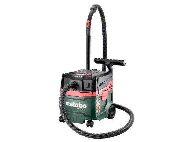 Metabo AS 20 M PC All-Purpose Vacuum for liquids and dry solids with commercial registration. Integrated PressClean filter cleaning allows for versatile application. Manually clean the filter using strong air flow by activating the switch on the extraction unit during breaks.