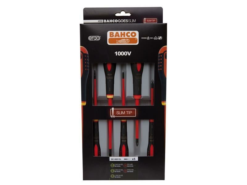 Bahco ERGO™ VDE Insulated Screwdrivers are suitable for work on live equipment, up to 1,000 Volts, high quality blade insulation moulded directly onto the blade. The high-performance alloy steel blade has been chrome plated and entirely hardened for high protection against corrosion, long life tool. A black oxide tip provides higher accuracy.