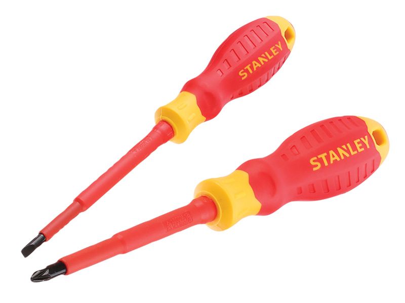 Stanley FatMax® VDE Insulated Screwdrivers feature slim insulation which allows access without modification and safe working to 1,000V. Their tri-material handles with soft grip, provide torque transmission and control. Hardened tips ensure a longer working life.