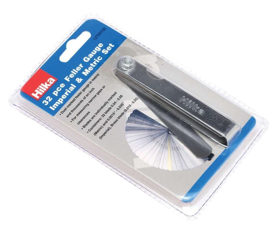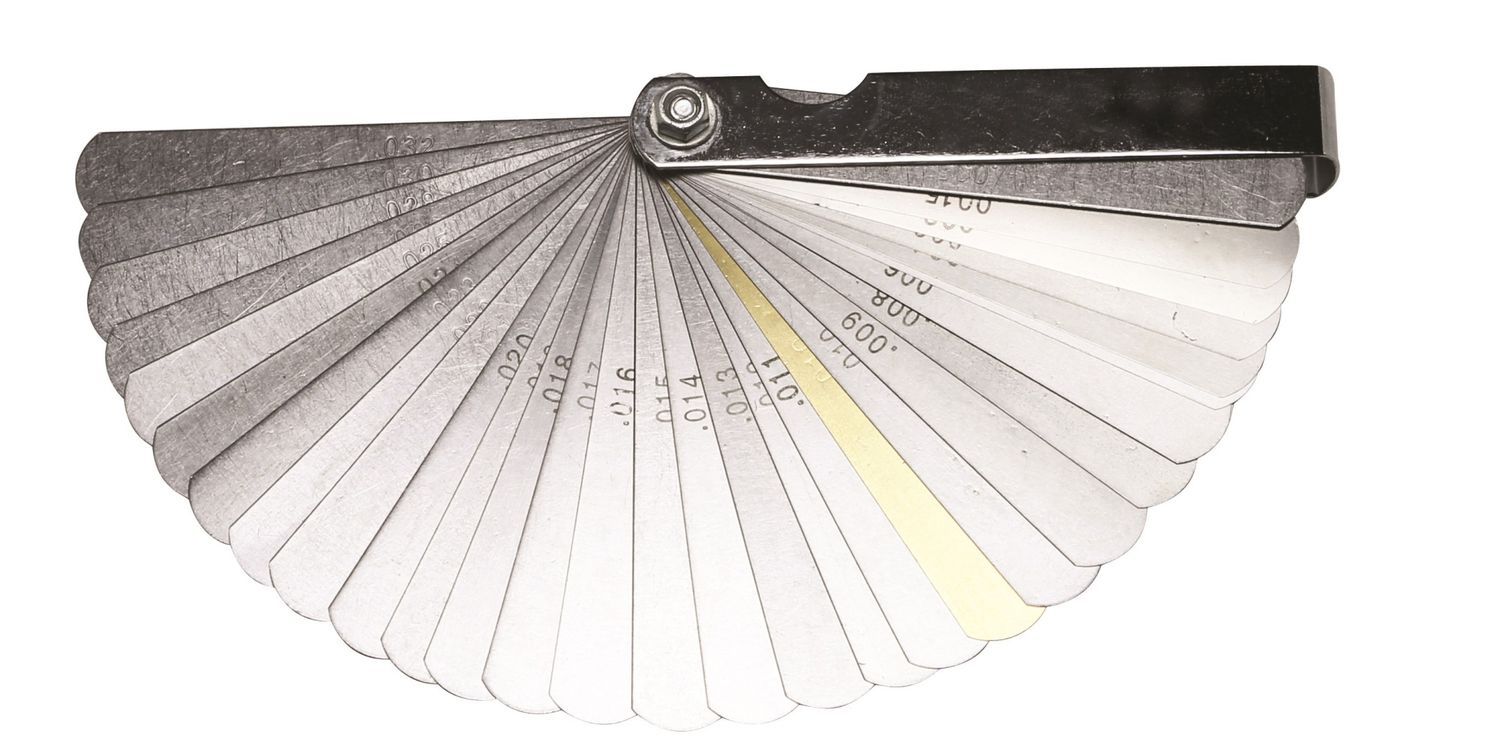 32 leaf dual marked feeler gauge for measuring narrow gaps or clearances. Dual marked feeler gauge in metric and thousands of an inch. Blades are individually marked. Contains: 32 blade 0.04 - 0.88 (metric) and 0.0015" - 0.035" (imperial), Brass blade (0.010 - 0.254). Blade length 75mm.