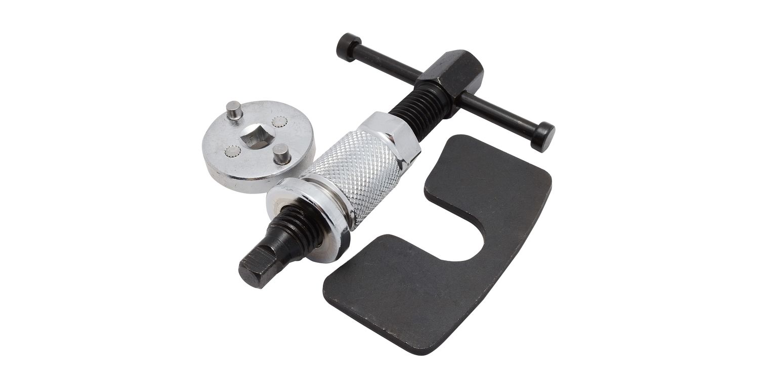 Right hand operated. Use on disc calipers to push the piston back into place. Simple turn handle operation presses piston back to allow for thickness of new pads. Suitable for most European and Japanese cars. Reaction plate and two adaptors included. 19mm hex end for sockets and spanners.