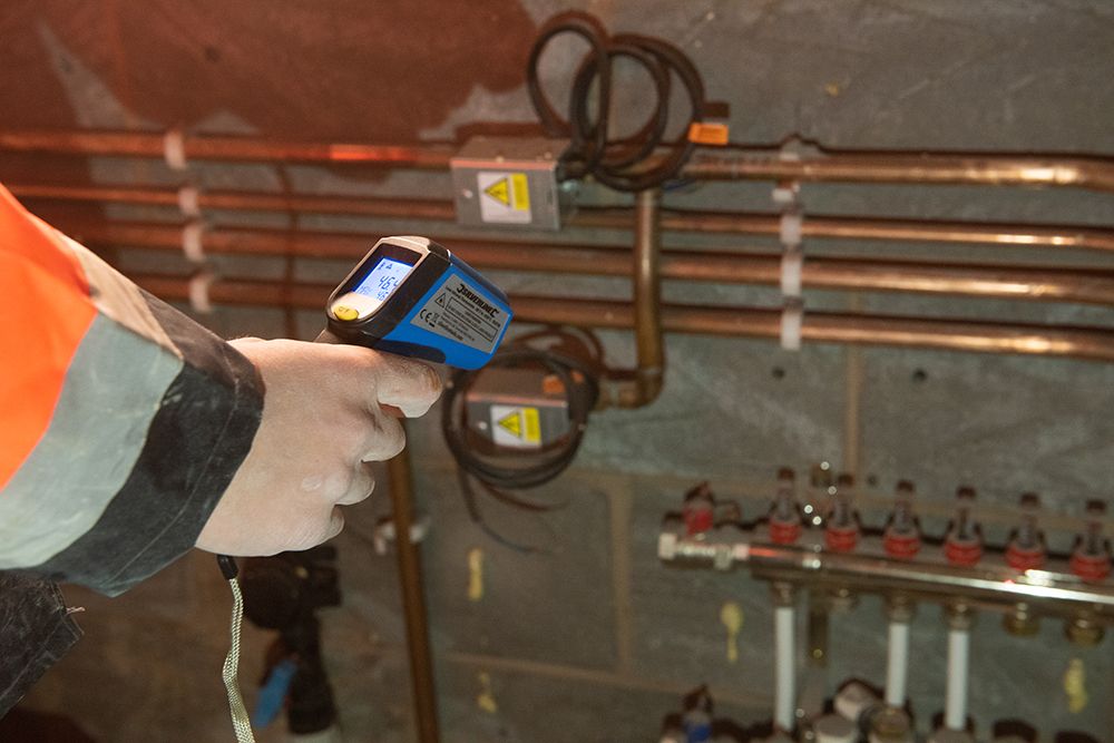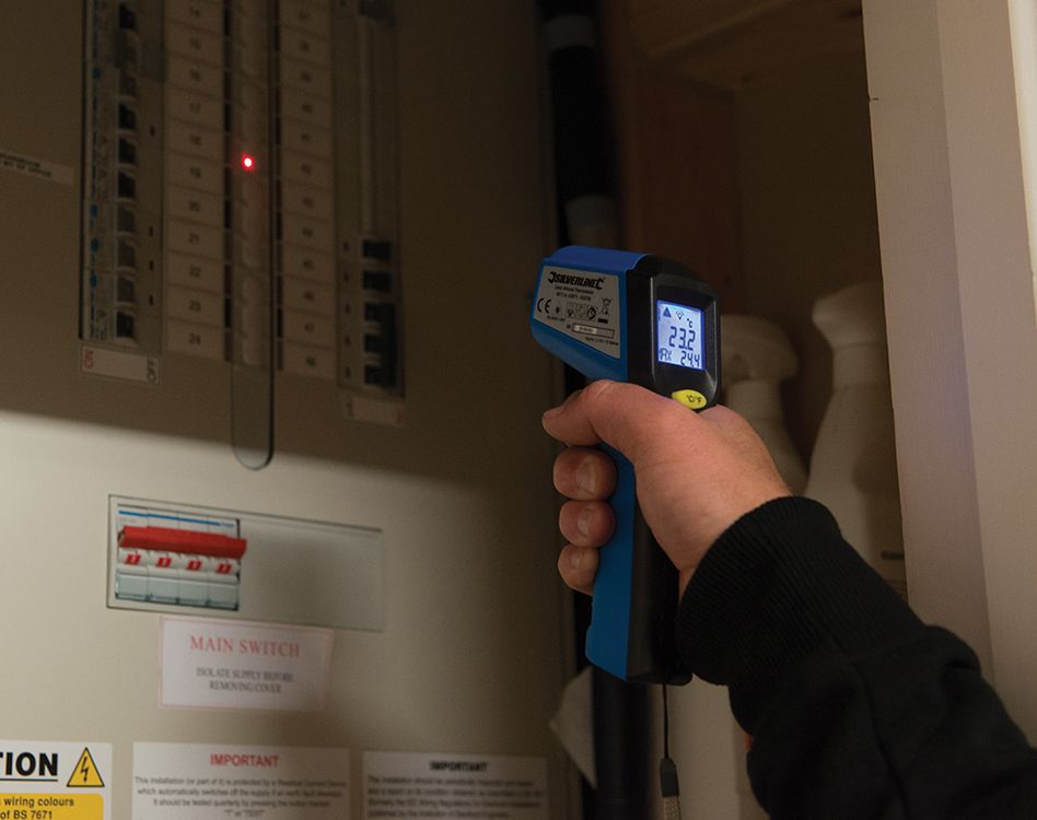 Pistol-grip infra-red thermometer with laser pointer for pinpoint targeting. LCD screen with backlit display. Measures in Celsius and Fahrenheit with range -38°C to +520°C (-36.4°F to +968°F) and accuracy of +/- 2°C (+/- 4°F). Requires 2 x AAA batteries (LR03).
