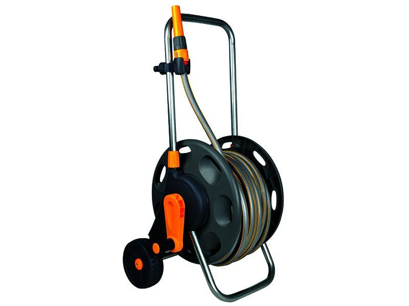 The Hozelock Assembled Reel has a small internal drum diameter and an extra-long winding handle, rewinding is easy. This hose reel has a robust metal towing handle, oversized soft patterned wheels and steel axle, which makes moving the hose reel easy.