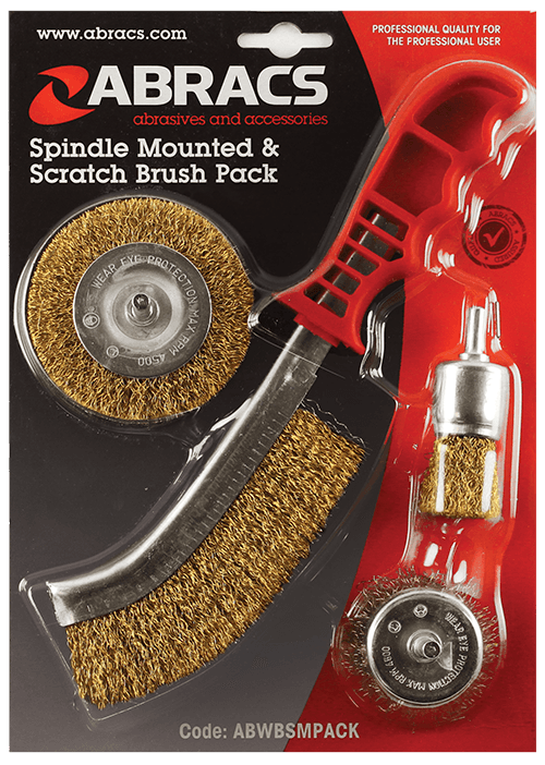 Spindle mounted and scratch brush pack for use on metal, rust and paint.