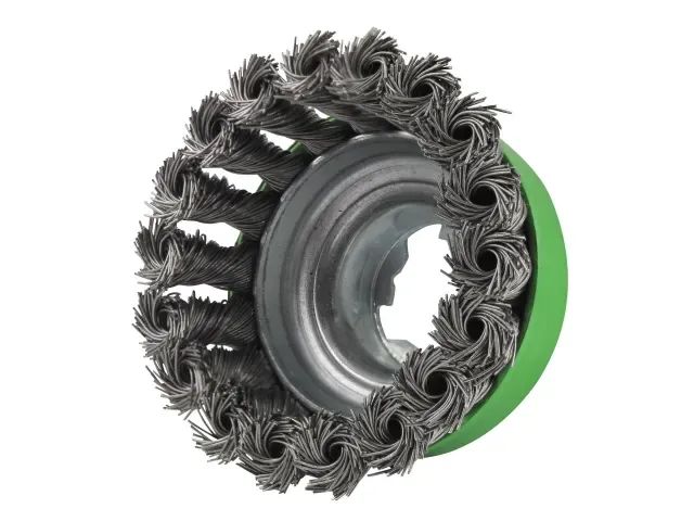 Faithfull X-LOCK Twist Knot Wire Brush for heavy-duty applications. Ideal for removing rust, paint and varnish. Use on stainless steel, aluminium and non-ferrous metal surfaces. Using standard wire brushes on stainless steel can contaminate and cause the material to rust.