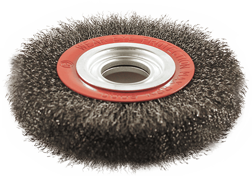 0.3 mm crimped steel wire brush suitable for bench grinders. Ideal for metal surface preparation and the removal of rust and scales. Supplied with bore reducing bushes from 32mm to 13mm.