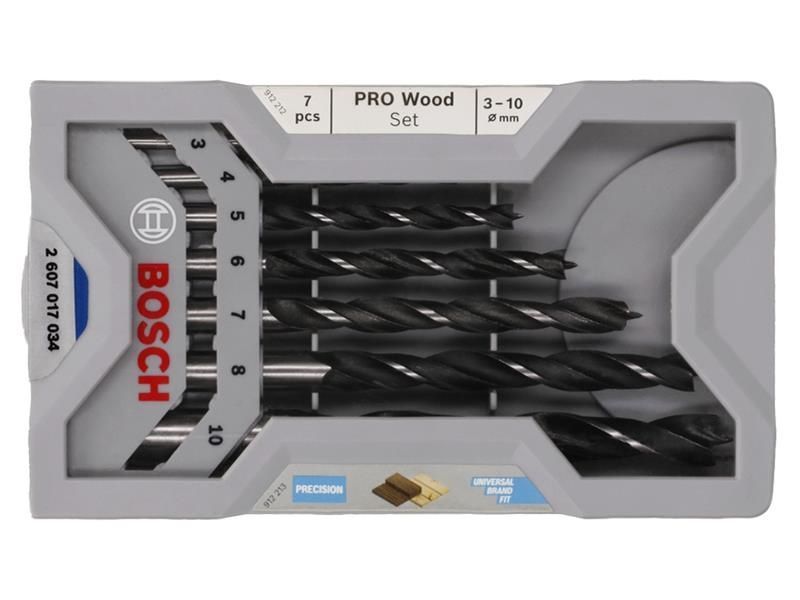 7 Piece Bosch Professional Robust Line Brad Point Drill Bit Set for precise drilling in hardwood and softwood. PRO Wood Brad Point Drill Bits are a great choice for woodworkers who need precise bits to drill through holes and pocket holes in hardwood and softwood. The drill bits have a centring trip, or Brad Point, preventing them from wandering when you start a new hole. The two flutes remove chips effectively and ensure you get the hole size you need. Sharp spurs reduce splintering so that you can drill clean, accurate holes faster and more efficiently.