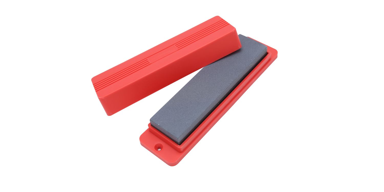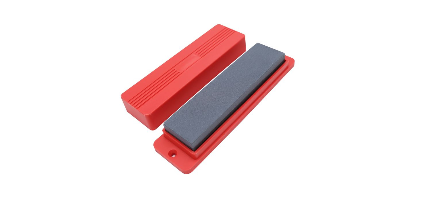 Size: 8" (200mm) x 50mm x 28mm aluminium oxide stone. With coarse and smooth faces and plastic case holder. Blister card packaging.