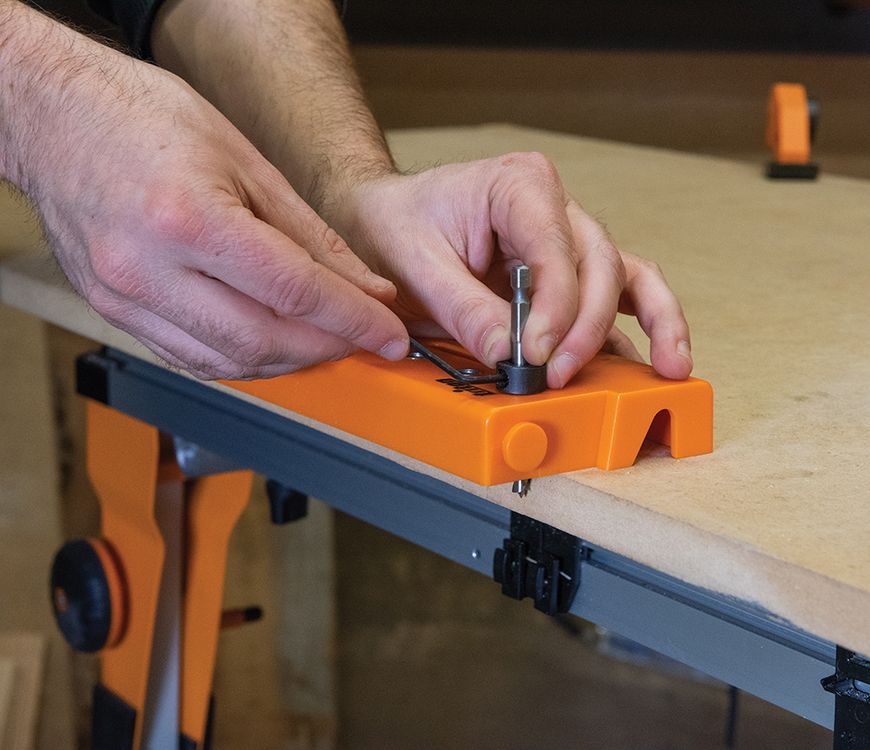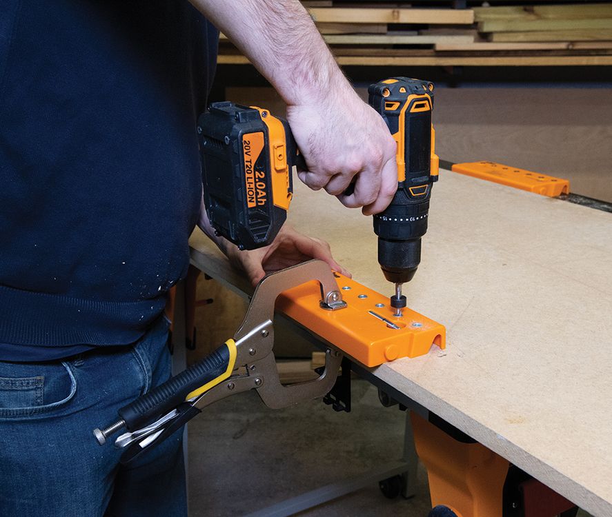 Simple slot-together system for joining 2 or more jigs. 7 drill guides spaced at 32mm intervals. Ideal for creating locating holes on adjustable shelving units such as cabinets and bookshelves. Incorporates retractable 30mm and 50mm side stops, plus a reinforced clamping zone. Includes pin, drill bit, collar and hex key, stored in the unit.