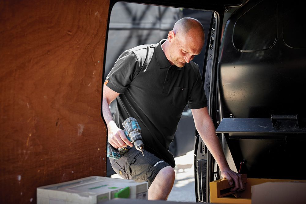 Naturally breathable and sustainably sourced cotton-rich fabric. Longer length to prevent riding up when working. Ribbed collar with button placket. Blank chest for printing or embroidery. 50% sustainably sourced cotton and 50% polyester, 220gsm.