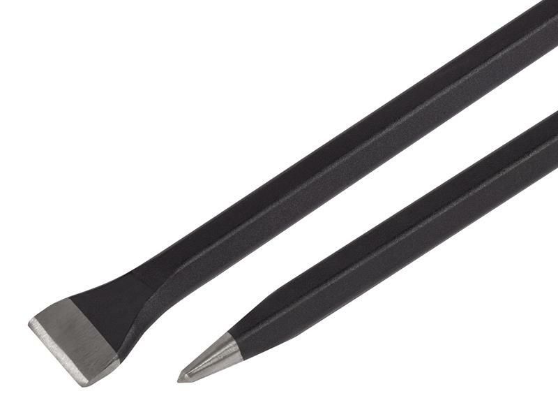 These Roughneck Digging Bars have a drop-forged steel construction with heat-treated working areas, and a black finish with polished tips. They have a chisel blade for general prying and breaking, and a pointed tip for breaking stone and concrete.